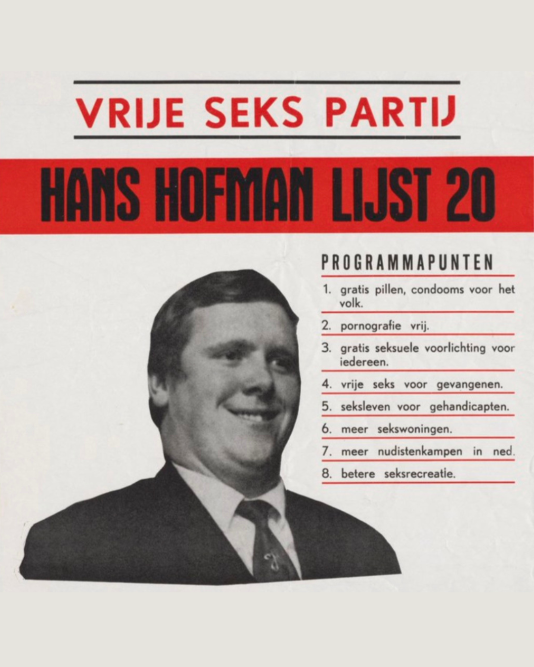 De verkiezingscampagne voor de verkiezingen van 29 oktober 2025 is dit weekend écht begonnen. Wist je dat er in 1970 een hele eigenaardige partij meedeed aan de gemeenteraadsverkiezingen van Amsterdam? De Vrije Sekspartij, met aan het hoofd Hans Hofman, werd gesponsord door het seksblad Candy. Dit tijdschrift was het eerste van zijn soort in Nederland.