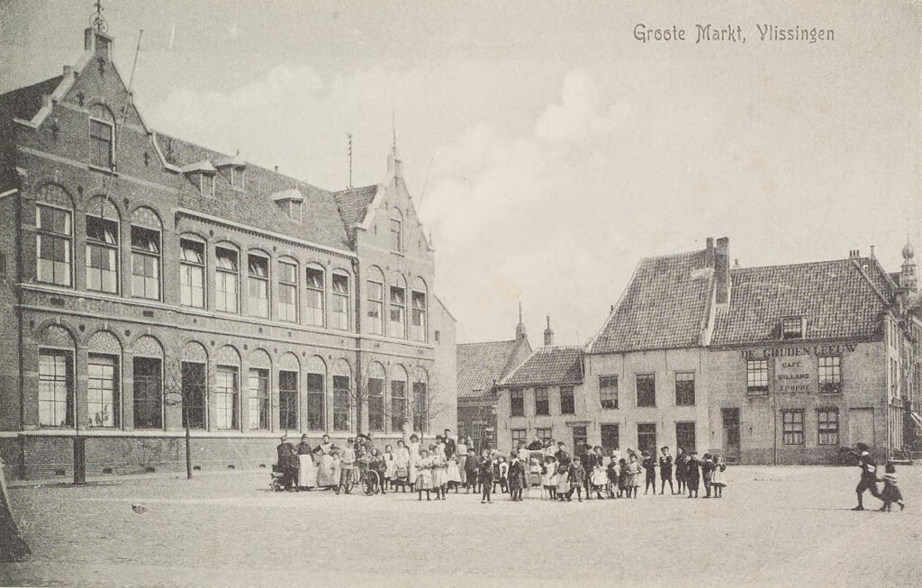Op de Grote Markt in Vlissingen staat tegenwoordig een woonwijk met een school. Ooit was dit het bruisende centrum van de stad.