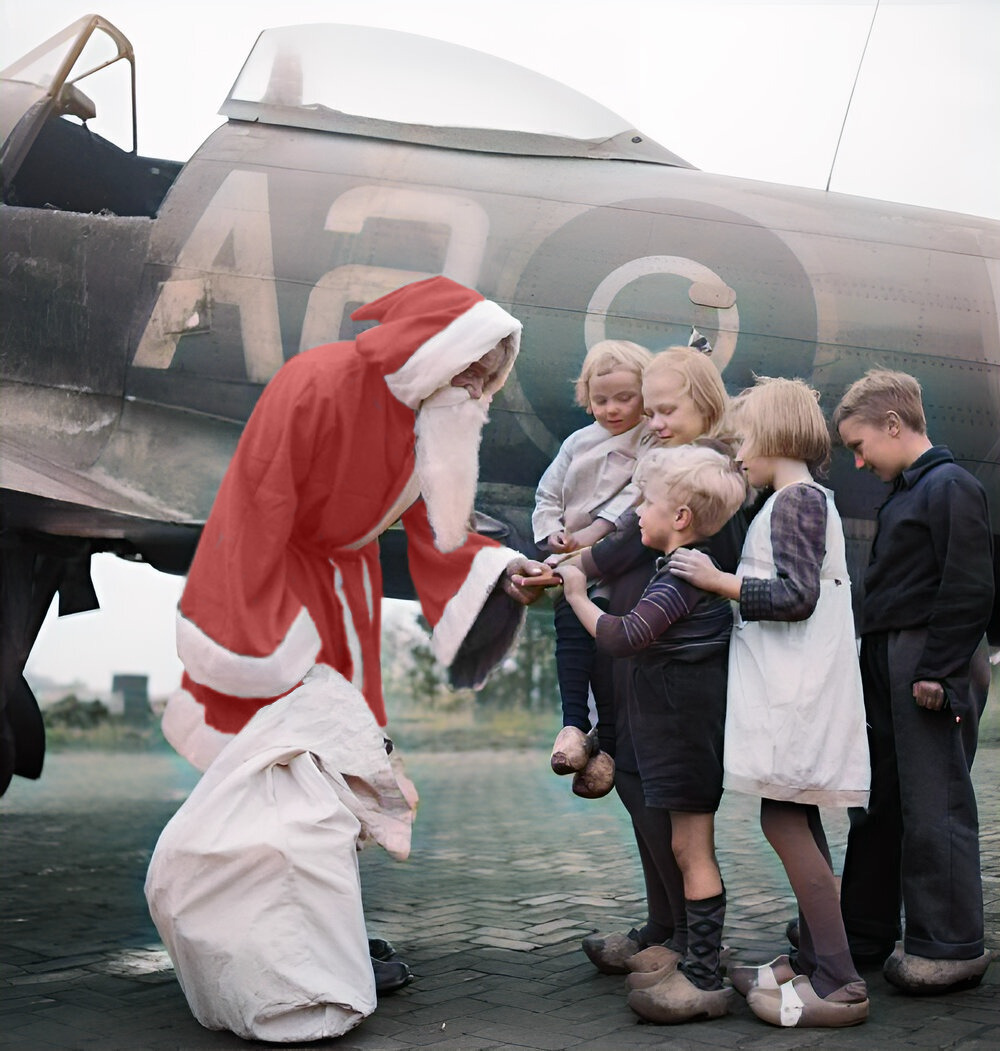 📸2: Een kerstman van dezelfde eenheid van de Royal Air Force deelt pakjes uit aan Nederlandse kinderen in december 1944.